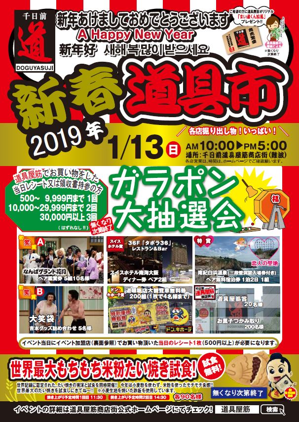 新春道具市では、イベント当日、道具屋筋商店街内でお買い物頂いた500円以上のレシート1枚で「ガラポン大抽選会」にご参加いただけます。